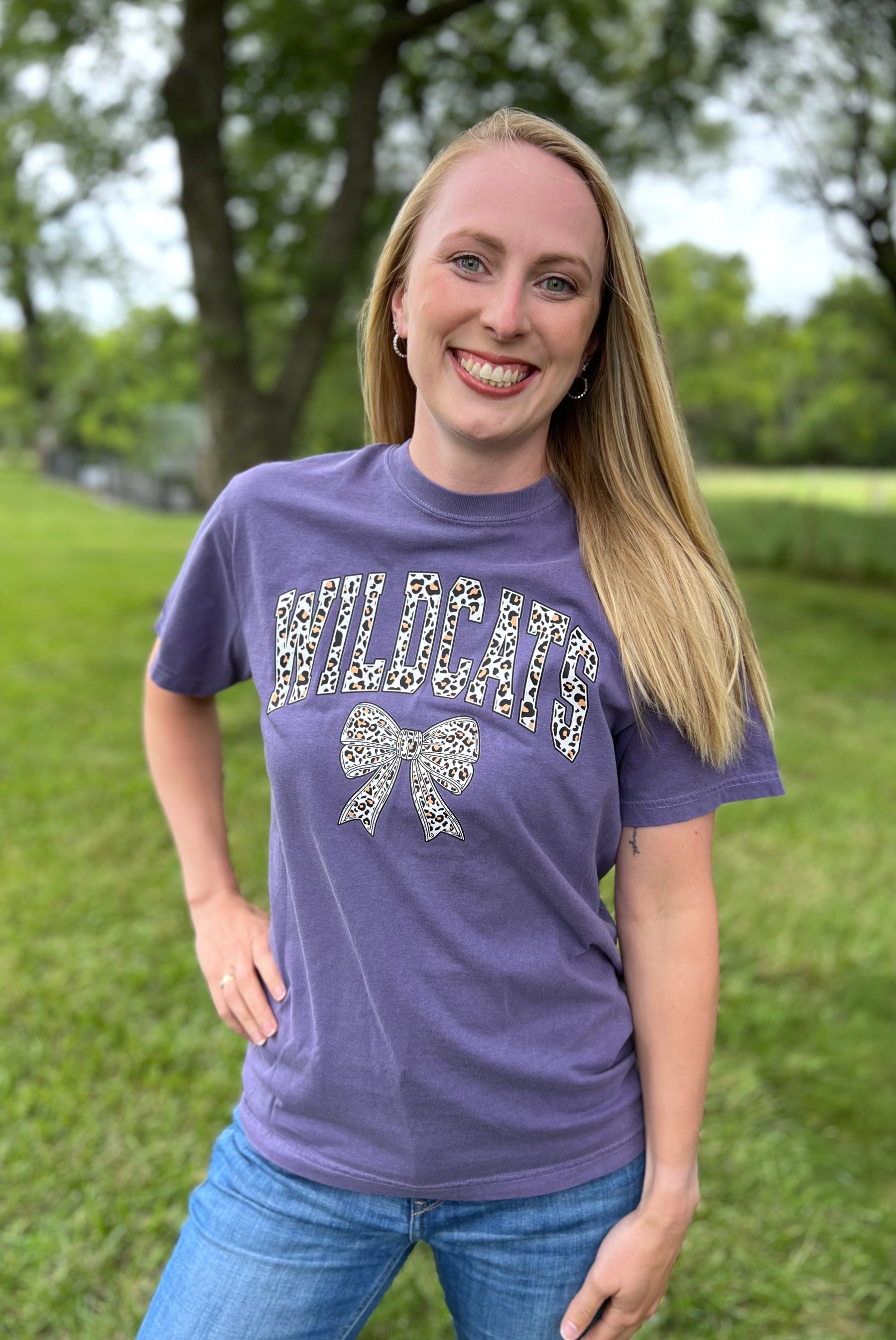 Roar into gameday with the *Whoa Nellie* Cats Leo Bow Tee! This spirited purple tee combines fierce leopard print with an adorable bow design that celebrates your Wildcats pride in the most fun way possible. Whether you're cheering from the stands or showing your team spirit all season long, this playful piece lets you rep your squad with personality and sass. Game on!