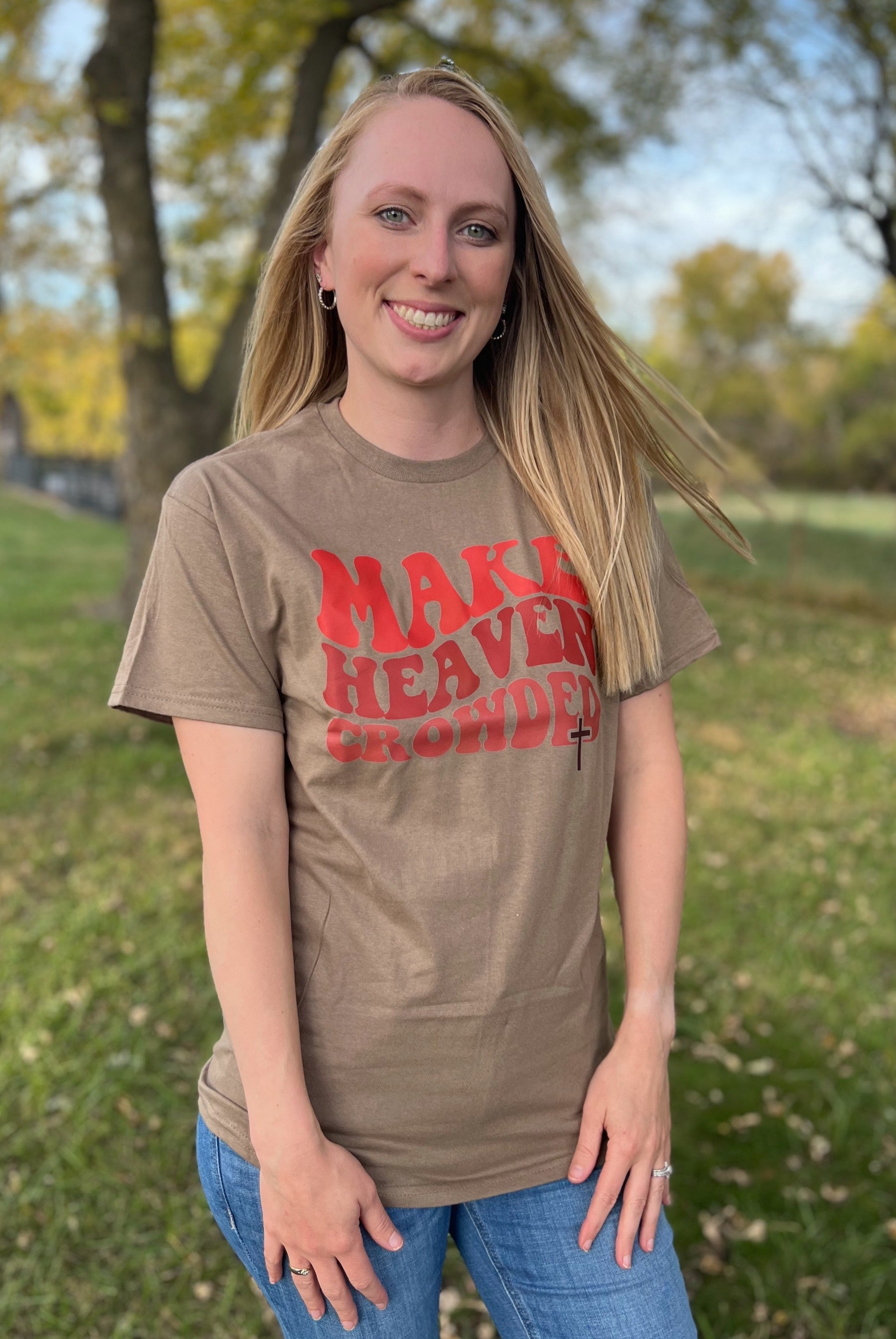 The *Whoa Nellie* Make Heaven Crowded Tee is a conversation starter wrapped in warm brown comfort. This playful tee features an uplifting message that brings a smile and a little spiritual sass to your everyday style. Perfect for anyone who loves meaningful fashion with a sense of humor, it's the kind of piece that sparks joy and good vibes. Soft, wearable, and totally you—this tee celebrates living life to the fullest with style and heart.